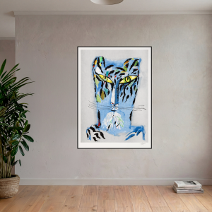 Den blå tigern av Madeleine Pyk är ett drömsk och poetiskt djurporträtt i svala blå toner. Färgsättningen ger verket en melankolisk skönhet och ett nästan surrealistiskt uttryck – typiskt för Pyks förmåga att omdefiniera det välkända. Signerad och numrerad litografi i begränsad upplaga.