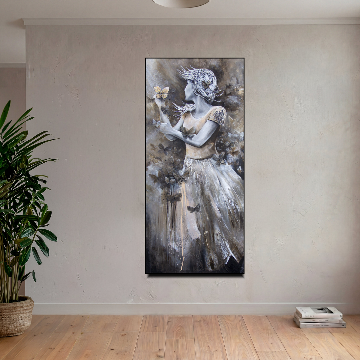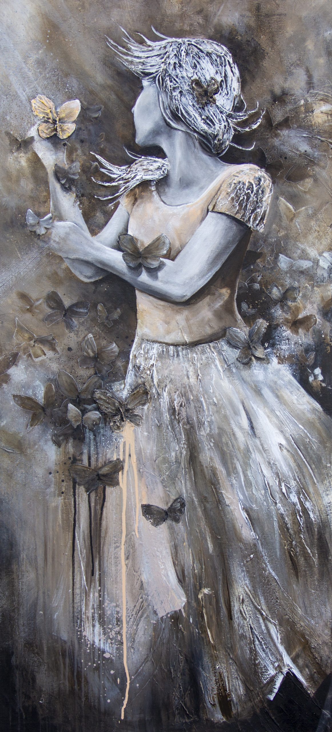 Fjärilsdrottning är en Akryl på duk av Marie Åkerlund i storleken 130×60 cm, signerad av konstnären. Verket präglas av Marie Åkerlunds karakteristiska bildspråk och är ett unikt tillskott för den som söker kvalitetskonst.