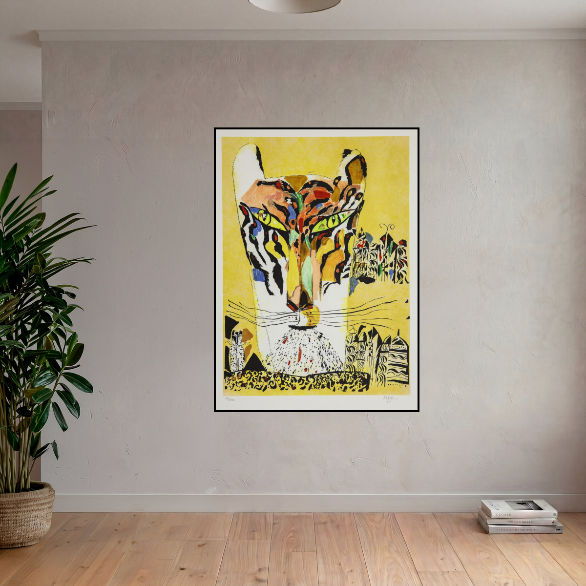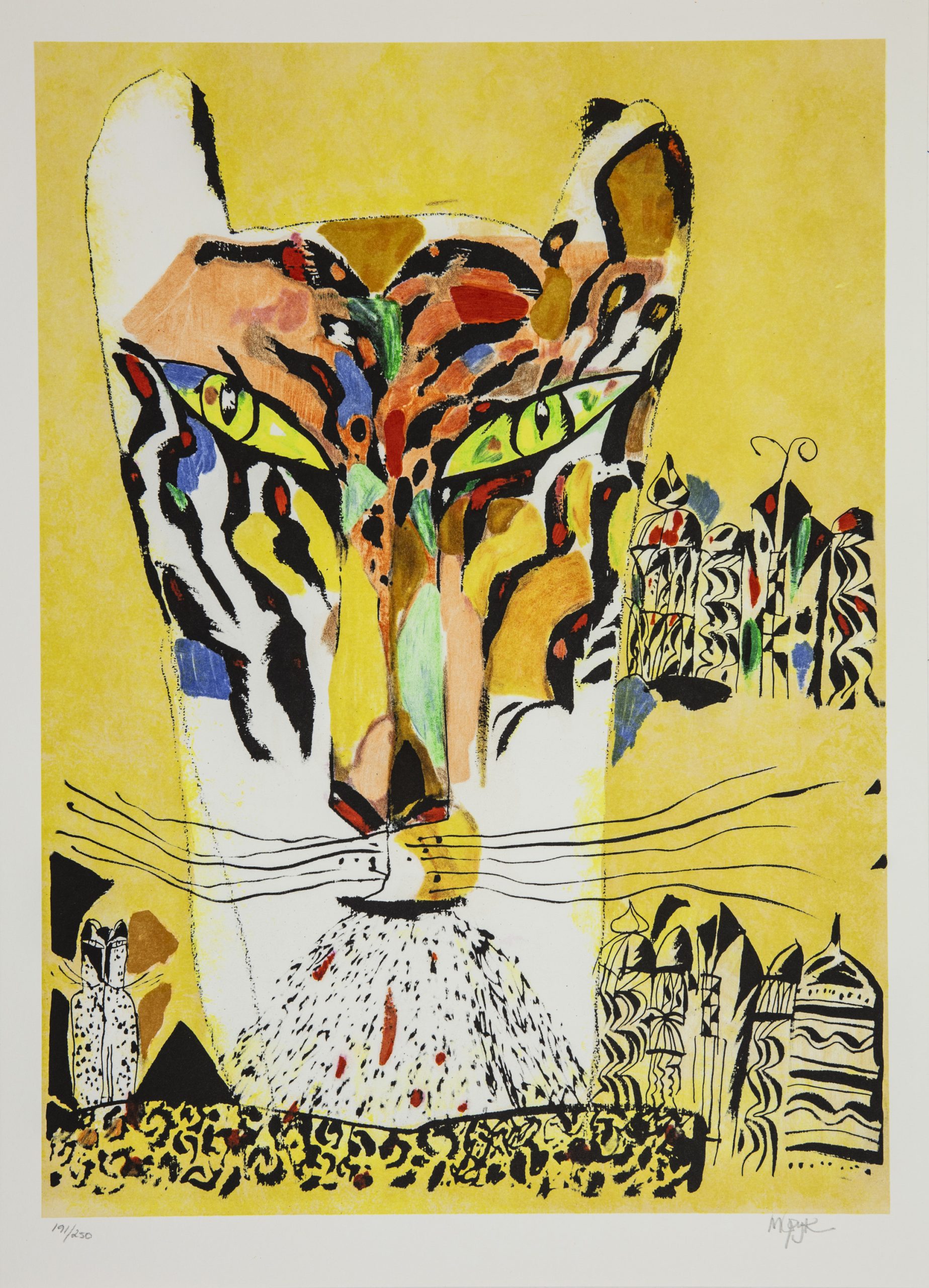 Madeleine Pyks gula tiger är ett starkt och lekfullt djurporträtt i hennes typiska sirliga och eleganta stil. Den gula färgsättningen ger verket en solig och energisk känsla. Signerad och numrerad litografi i begränsad upplaga från en av Sveriges mest folkkäre konstnärer.