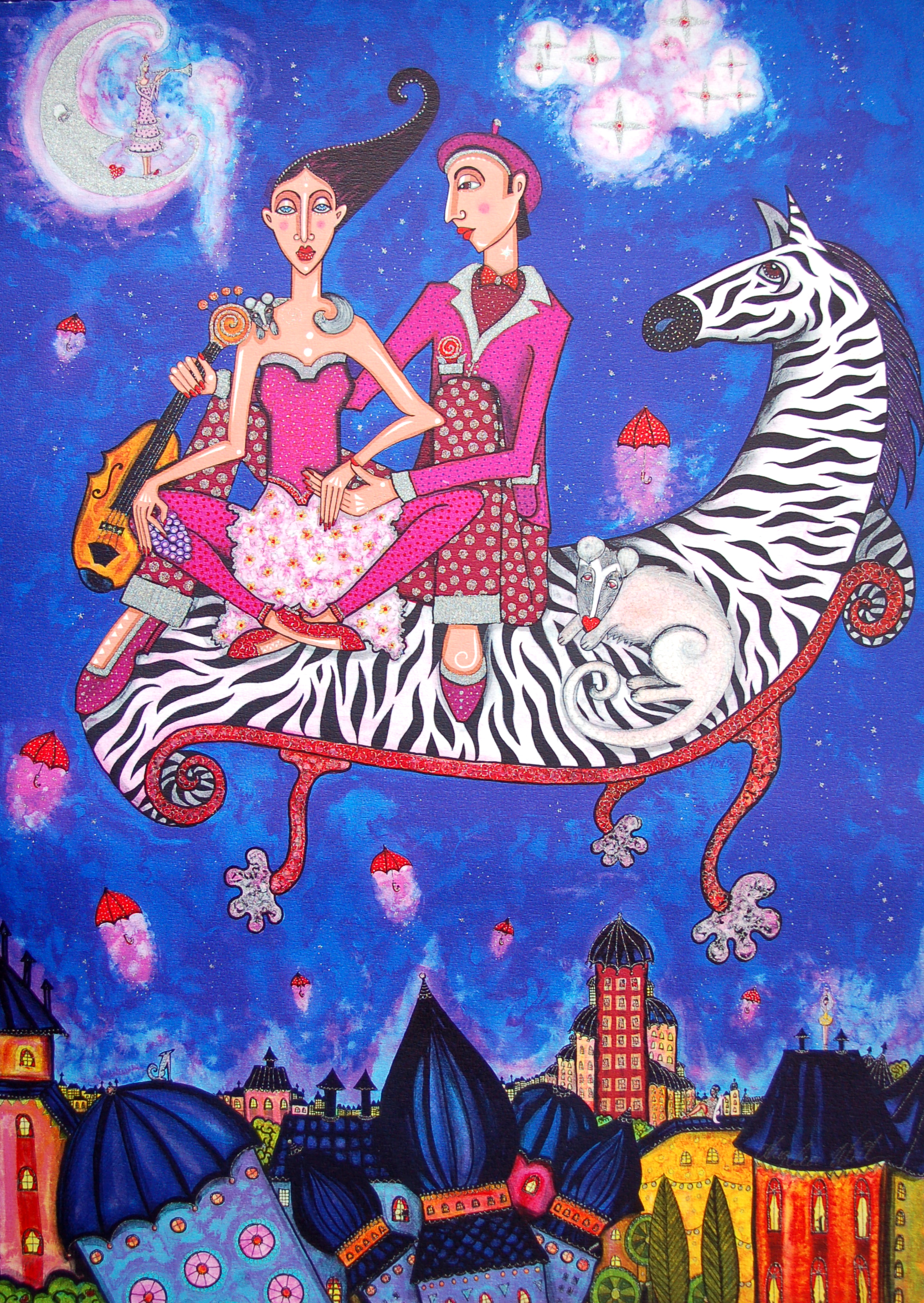 Angelica Wiik är en nutida svensk konstnär som älskas av sin publik för sina färgexplosiva och expressiva målningar. Det är uttalad feminism och kärlek till människor, stadslandskap och djur som får hennes tavlor att lyfta och hon är inte blyg när det gäller färgsättning eller val av motiv. Hennes bilder är som sköna drömmar med musiker på taken och hundar i fönstren. Det är bilder som förför den betraktare som vill bli förförd. Det är bilder man blir glad av att betrakta.
