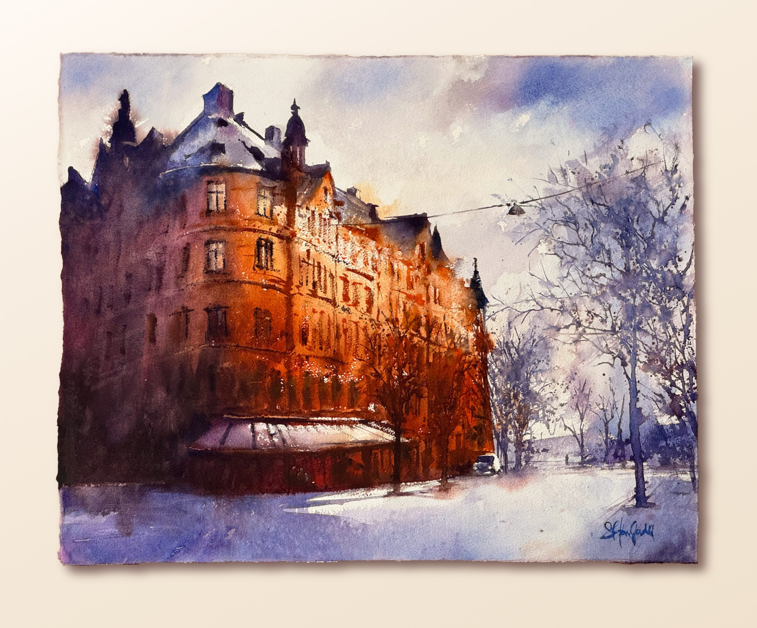 Livfulla stadsvyer och kärleken till motljus – det är alla återkommande motiv i Stefan Gadnells konstnärskap. En stad, ett hus, bilar, några människor som är på väg, det är viktigt att det händer något, att bilden har en berättelse. Stefans akvareller är fyllda med rörelse och närvaro, men det är betraktaren som gör bilderna levande.