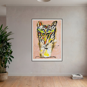 Den rosa tigern är ett lekfullt och elegantly djurporträtt av Madeleine Pyk. Med sin rosa färgsättning och Pyks karaktäristiska mjuka penselföring utstrålar verket femininitet och stilfullhet. Signerad och numrerad litografi i begränsad upplaga.