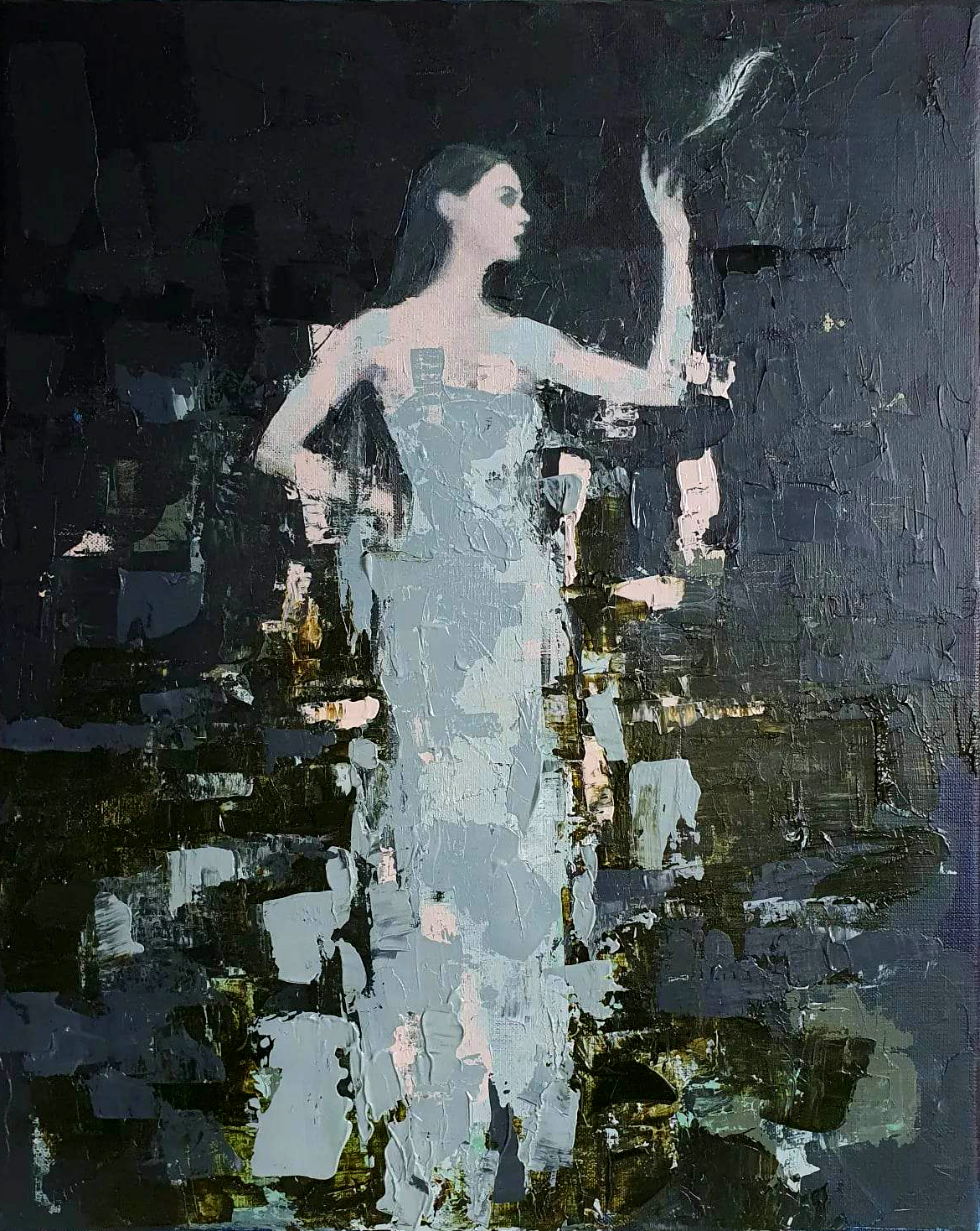 Carolina målar främst med akryl på duk och hoppar mellan att använda pensel och målarkniv då hon älskar kontrasterna mellan mjukt och hårt.